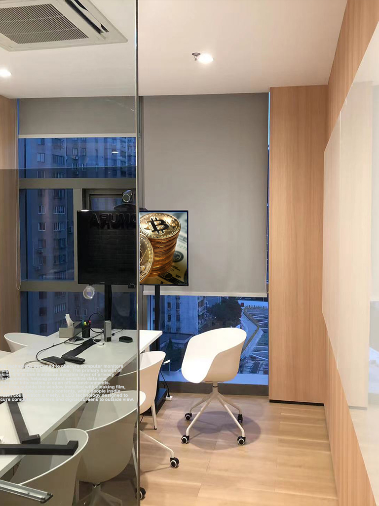 Also called Nano cloaking film or Data Jammer Film. It's commonly used as an architectural film for glass walls and office windows. Cloaking film is a LED technology designed to obscure computer monitors and digital screens to outside view. The primary benefit of cloaking film is that it adds an invisible layer of privacy against screens, helping protect sensitive data and confidential information in open office environments. People from outside the window installed with cloaking film, can not see inside screen's contents, while people insdie the room could watch it freely.